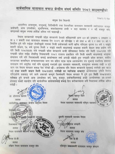 ‘आजसम्म पनि नेपाल सरकारले सुनुवाइ नगरेको हुँदा बाध्य भइ हाम्रा सवारी साधन मिति २०८२र२र१९ गतेदेखि घर, ग्यारेजमा थन्काएर आन्दोलनमा उत्रिने निर्णय गरिएको’, विज्ञप्तिमा उल्लेख छ ।