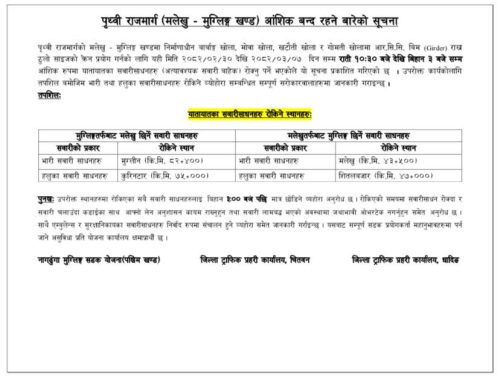 सूचना अनुसार राति साढे १० बजेदेखि बिहान ३ बजेसम्म सडक बन्द रहनेछ । मुग्लिनबाट मलेखुतर्फ गुड्ने ठूला गाडीलाई मुग्लिन र साना गाडीलाई कुरिनटारमा रोकिने सूचनामा उल्लेख छ । यस्तै मलेखुबाट मुग्लिनतर्फ गुड्ने गाडीमध्ये ठूला गाडी मलेखु र साना गाडी शीतल बजारमा रोकिनेछन् ।