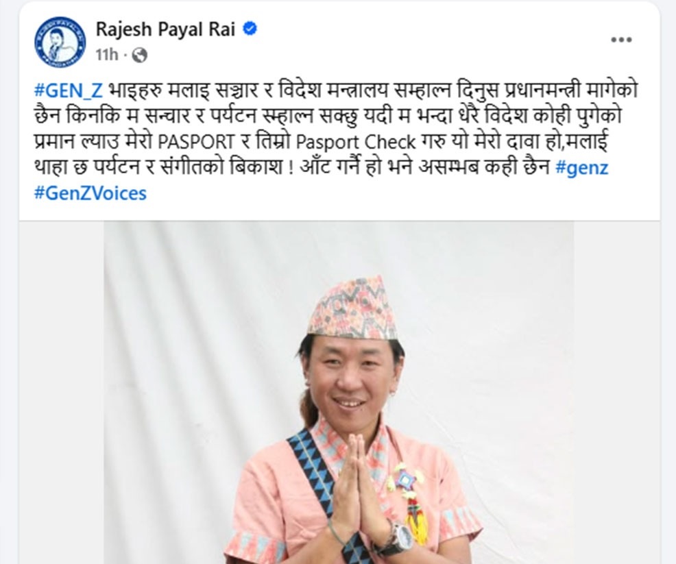 काठमाडौं । गायक राजेश पायल राईले जेन–जी पुस्तालाई आफूलाई सञ्चार तथा पर्यटन मन्त्रालयको जिम्मेवारी दिन आग्रह गरेका छन्।