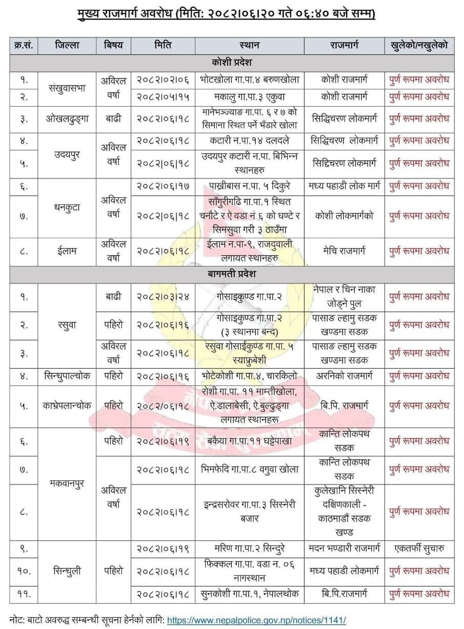यससँगै नेपाल–चीन जोड्ने सीमा सडक र कुलेखानी–सिस्नेरी–दक्षिणकाली–काठमाडौं सडकखण्ड समेत पूर्णरूपमा अवरुद्ध रहेको प्रहरीको जानकारीमा उल्लेख गरिएको छ ।